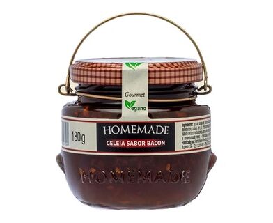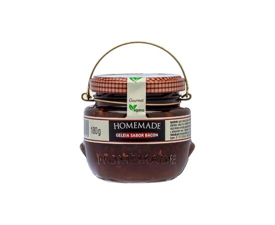 Geleia  com um toque defumado de  bacon , porém, vegana, sem nenhum ingrediente de origem animal. Saborosa, fica muito boa com torradas, sanduíches, grelhados e outros preparos.