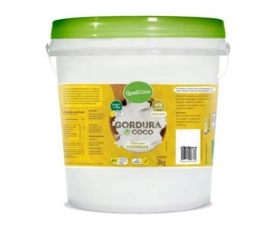 A gordura de coco da Qualicoco tem processo de fabricação a partir da extração dos frutos secos. Tem rápida absorção ao organismo convertendo rapidamente em energia. A gordura de coco é livre de gordura trans e colesterol. Ideal para preparo de sorvetes, pães, bolos, grelhados, vitaminas e frituras em geral. Peso liquido do produto 3 kg .