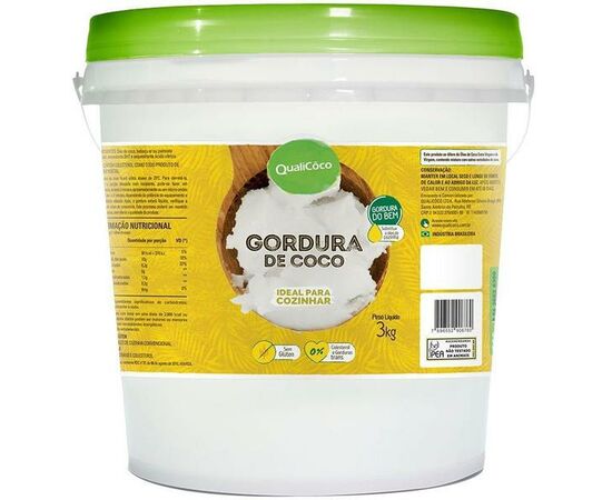 A gordura de coco da Qualicoco tem processo de fabricação a partir da extração dos frutos secos. Tem rápida absorção ao organismo convertendo rapidamente em energia. A gordura de coco é livre de gordura trans e colesterol. Ideal para preparo de sorvetes, pães, bolos, grelhados, vitaminas e frituras em geral. Peso liquido do produto 3 kg .